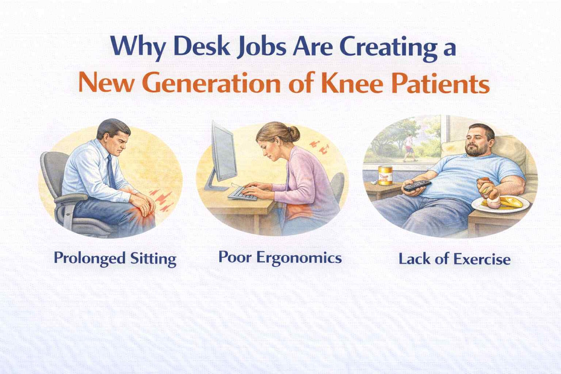Desk jobs may appear physically harmless, but they are silently damaging knee health across all age groups. Prolonged sitting, poor posture, weight gain, and lack of movement are creating a new generation of knee patients who suffer from chronic pain, stiffness, and reduced mobility.